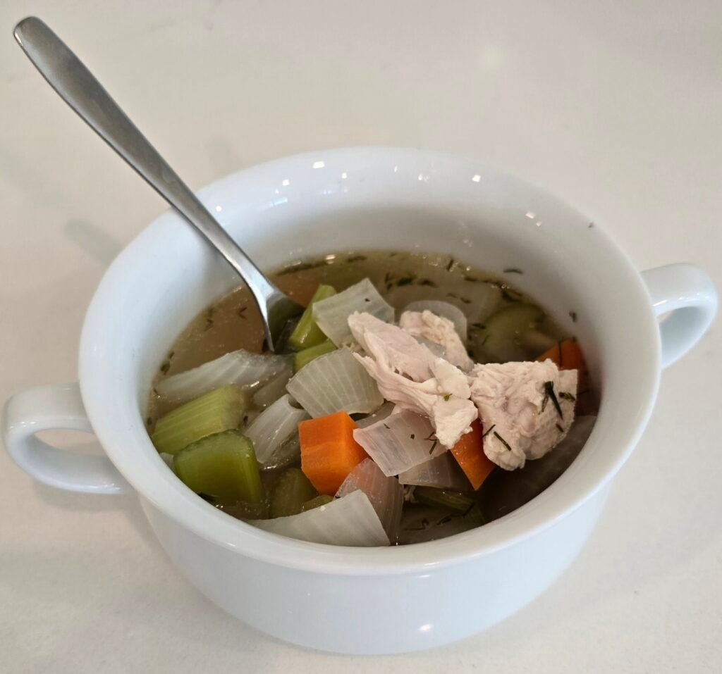 Instant Pot Homemade Chicken Broth and Soup Once you’ve made this broth, you’ll never want canned soup again! Ingredients: 1) One whole pasture-raised chicken, if possible corn and soy free. 2) One bunch of celery 3) One large carrot 4) One large onion 5) Dried thyme 6) Dried dill 7) Quality sea salt 8) Ghee 9) Two cups of water (500 cc), plus an additional two cups reserved. Start by cleaning and chopping the vegetables and setting them aside in a bowl. I used four stalks of celery. Peel and chop one carrot. Coarsely chop one large onion. The texture of the vegetables can be adjusted by changing the size of the pieces. Leave them larger for a crunchier texture, or cut them smaller for a softer texture. Process the whole chicken by separating it into parts. There are many YouTube videos showing how to do this. Use whichever method works best for you. I prefer to cut the wings at the joints. Then, separate the back from the “crown” (the two breasts and bones together). Finally, remove the legs and include the “oyster” meat. The back and rib cage will flavor the broth, which is the base for the soup. If you like dark meat in your soup, include the leg quarters. Do not cook the white meat when making the broth, as it will overcook. If you prefer white meat in your soup, cook it separately. See the sous vide chicken breast recipe for instructions on cooking the white meat. I like to vacuum seal and freeze any leftover meat I won’t use. Turn on the Instant Pot to sauté and add two tablespoons of ghee. For a more Asian flavor, you can use coconut oil and finish with ginger and scallions. When hot, add the backbone with the skin. If the chicken is small, add the wings as well. Coat the chicken in the melted ghee and leave it alone for about five minutes. The goal is to caramelize the skin for flavor. If you have a second Instant Pot, now is a good time to vacuum seal and sous vide cook the white meat. Add one teaspoon of salt and scrape the chicken loose. Then, add half a cup of water to deglaze the bottom. Use your heavy spatula to scrape it clean. We want that flavor in the broth. Turn the Instant Pot off. Add the remaining water to make 2 cups total. Close the lid. Pressure cook on high for 12 minutes, followed by a 5-10 minute natural decompression. Then, open the pressure release valve. Place the chopped vegetables in a pot along with one to two teaspoons of dried thyme and/or dill. Use whatever flavor you prefer. Add another teaspoon of salt. When the chicken broth is finished, pour it over a strainer placed over the pot of vegetables. Add the remaining two cups of water, stir, and bring to a boil. Watch carefully, and turn off the heat just as the broth begins to boil. While the broth comes to temperature, pick off any dark meat from the wings and back, reserving it to put into the soup stock. As soon as it begins to boil, turn off the heat, add the dark meat, and cover. Do not stir. Once cooled, add the sous-vide-cooked white meat and reheat to serve. Alternatively, you can refrigerate it and remove the fat layer on top the next day for a lower calorie version that still tastes better than anything from a can.