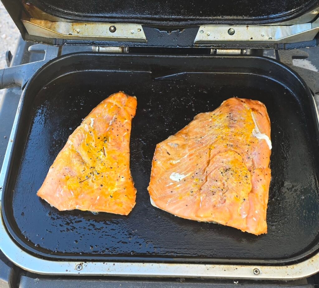 Frozen salmon: sous vide, brined, and grilled. Most of the year, fresh salmon is unavailable, so we have to choose frozen. This easy recipe produces great salmon flavor every time. Start with a sous-vide-safe bag or a vacuum seal. Set the Instant Pot to “Sous Vide” or use a dedicated sous vide device. The temperature should be set to 113°F for a very soft texture or 122°F for a flaky texture. The cooking time is 70 minutes for most pieces that are 1 inch thick. Add another 30 minutes if your piece is 1.5 inches thick. Turn on the Instant Pot, but wait to add the salmon until it reaches the correct temperature. Unlike animal meats, which go in during the warm-up period and turn out fine, salmon will overcook. When finished, remove the salmon from the water, open it up, and place the salmon on a baking rack. Sprinkle with salt, pepper, turmeric, or other spices as desired. Place in the refrigerator for at least 30 minutes and up to overnight. To finish: Start your grill on high. Rub both sides of the salmon with olive oil. Place it skin side down on the grill and cook for three minutes. Do not flip. Remove and enjoy!