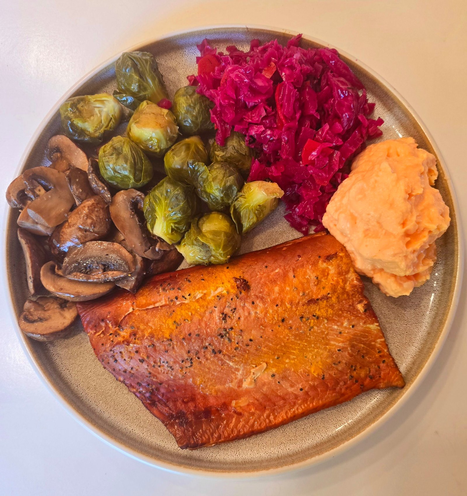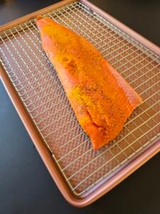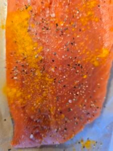 My favorite dry brine for salmon is coarse salt, turmeric and black pepper.