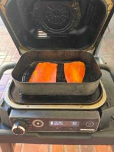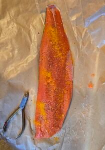 This recipe starts with a dry brine of at least a few hours or overnight. You can remove the small bones at any stage in this recipe. I often prefer to do it after cooking as they can tear and pull meat if done when the fish is fresh/defrosted and raw.