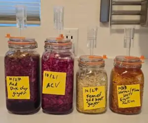 When you’re ready to eat, remove the airlock, close the hole, and put it in the refrigerator overnight. The next day, empty the contents into a container and let it gas off for a couple of hours. Sulfur-producing bacteria create some of the amazing compounds. The finished sauerkraut will last for weeks in the refrigerator, but it will likely be eaten long before then. Check out the equipment page to find the jars, funnels, and pounders to make your own amazing fermented vegetables!