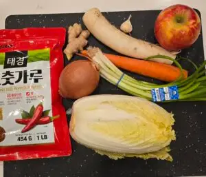 The photo shows all the ingredients except the salt. Split and chop the napa cabbage but reserve one leaf for the top. Rough chop onion, and radish. Peel and slice the apple. Julienne the carrot if you want or just slice. Finely chop the garlic and peeled ginger.